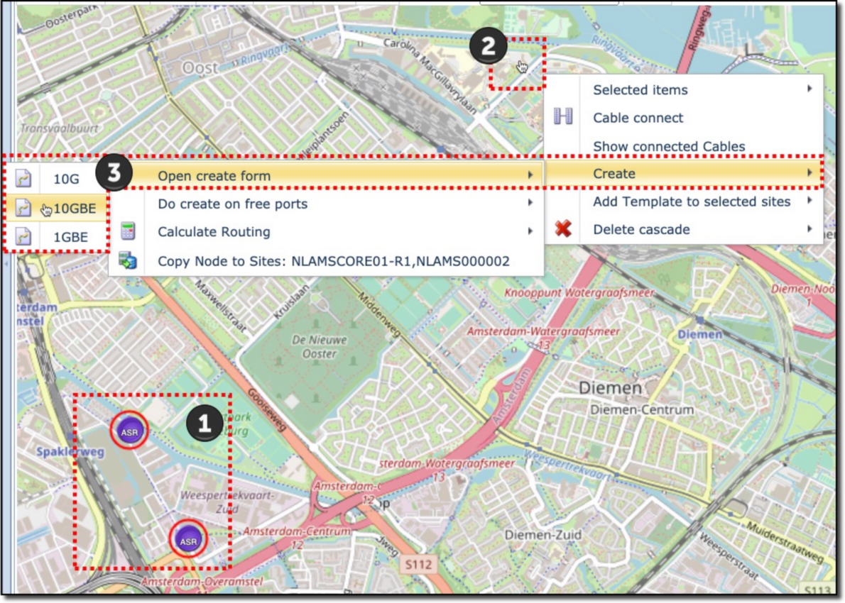 Locate the first node on the map and left click it to reveal a drop down list of ports - you may need to scroll down - and select the required port |